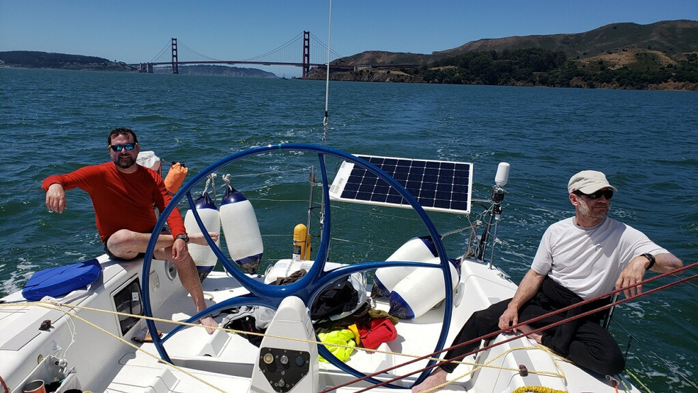 The next leg from central Oregon to Cape Mendocino was a building northerly. It started as 15 knots and eventually built into high 30s. We downshifted from a small jib (J4) and a full mainsail to a J4 and reefed mainsail, then to a J4 and double reefed mainsail, and finally just a J4 and no mainsail. Our speeds ranged from 8 knots up to 20 knots, a new record for us on the boat. We were able to make up a lot of time and sailed into San Francisco Bay around noon on Monday, seven days aver we departed Olympia.